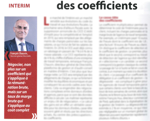 PresseDans la lettre des achats d'avril 2018, François Chauvin, Directeur général de DIRECTSKILLS explique pourquoi le calcul des coefficients joue un rôle essentiel dans la négociation des achats d'intérim.Avec une hausse de plus de 8% en 2017,…