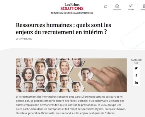 PresseC'est sur le site web "Les Echos Solutions", Service et conseils aux entreprises, que François CHAUVIN, Directeur général de DIRECTSKILLS donne son avis et partage son expertise sur les enjeux du recrutement intérim pour les Ressources Humaines.